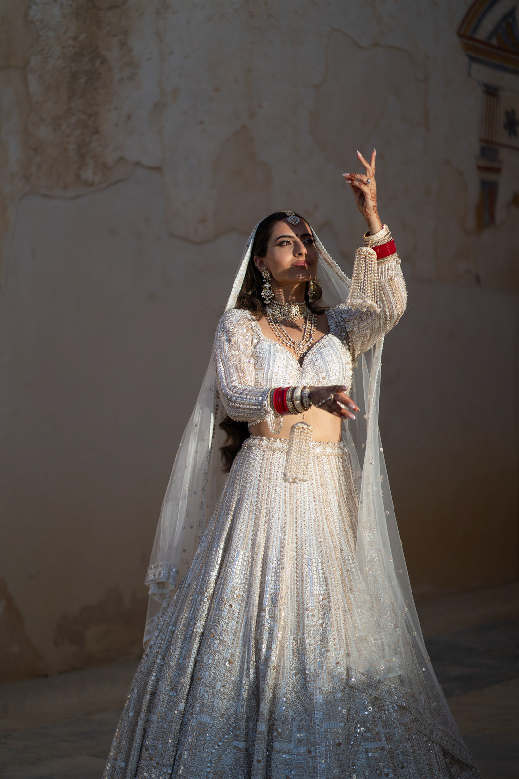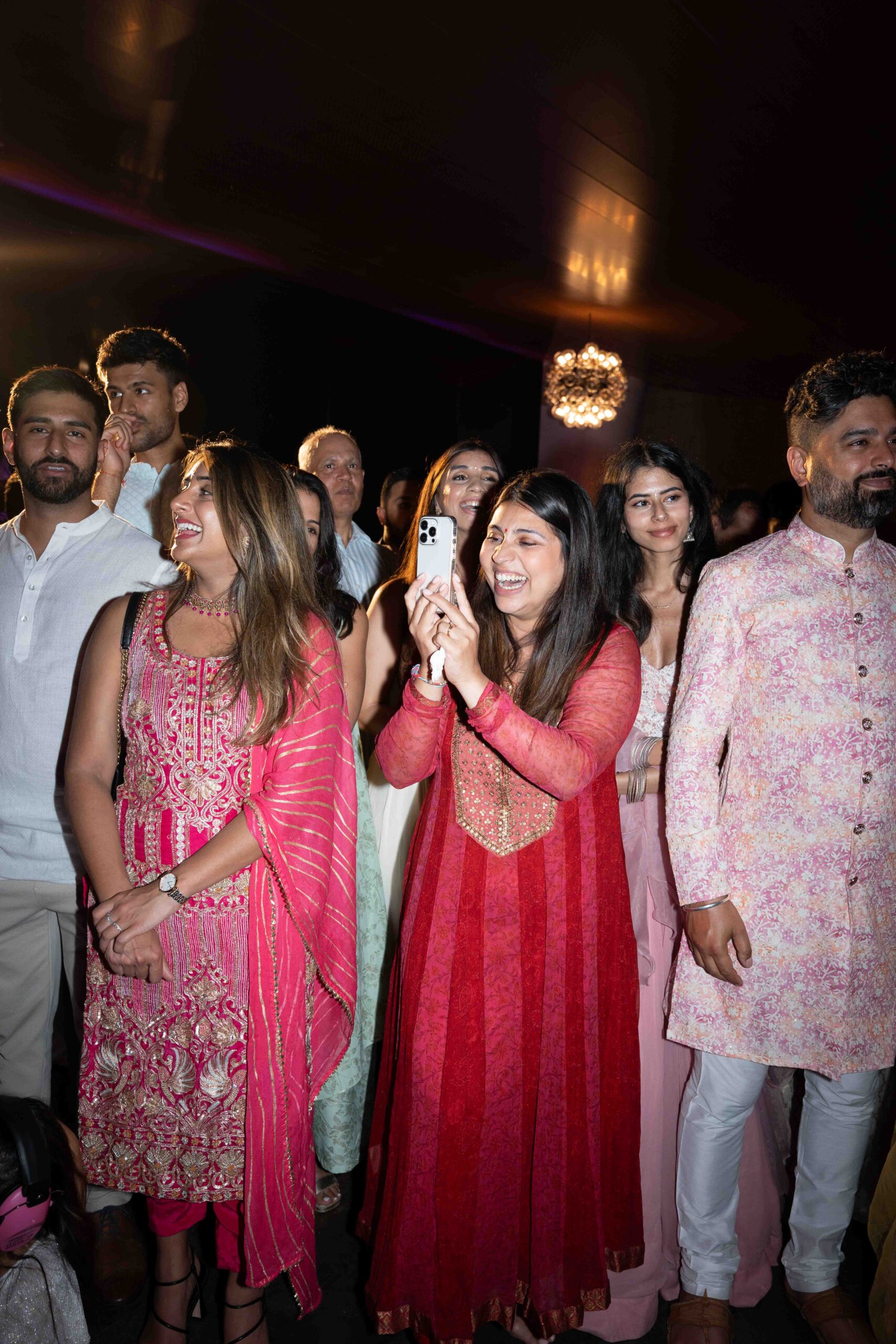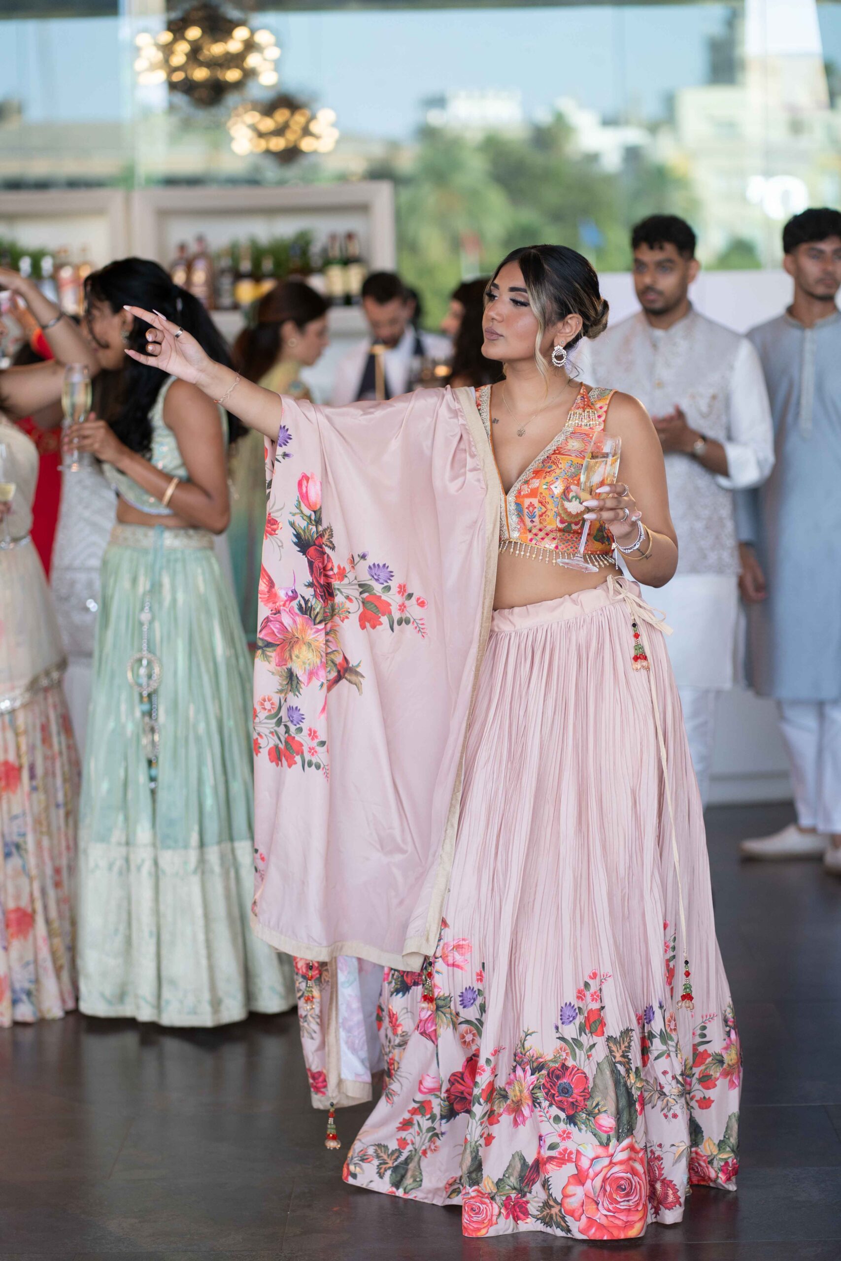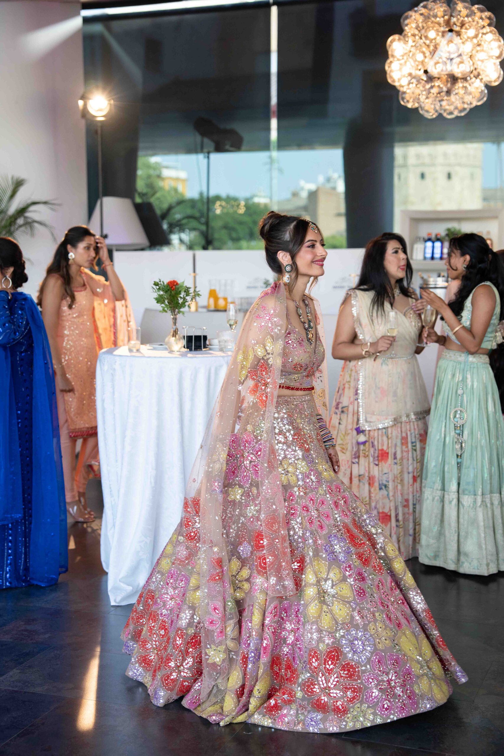 Am ersten Tag begann das Fest mit der Mehndi-Zeremonie, bei der die Hände und Füße der Braut mit kunstvollen Henna-Mustern verziert wurden. Die intime Veranstaltung setzte die Braut in den Mittelpunkt und bot ruhige, persönliche Momente. Später am Abend verwandelte sich die Stimmung in eine ausgelassene Feier während des Sangeet, bei der Freunde und Familie gemeinsam tanzten und den Beginn der Hochzeitsfeierlichkeiten feierten.