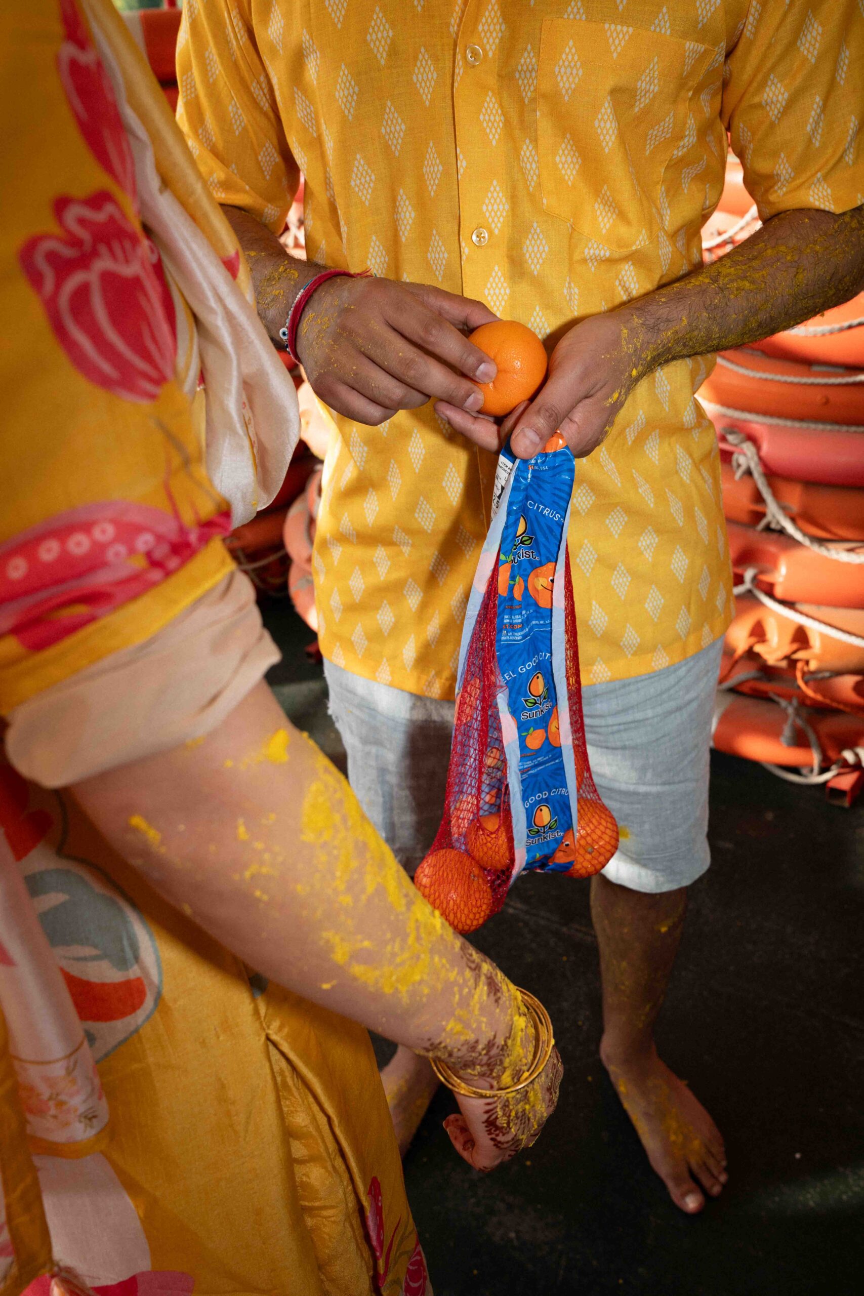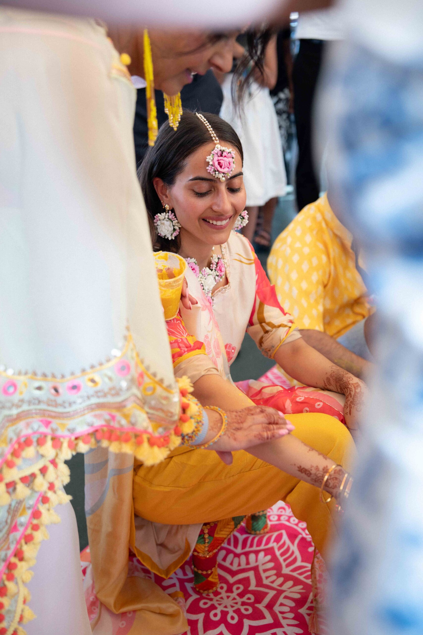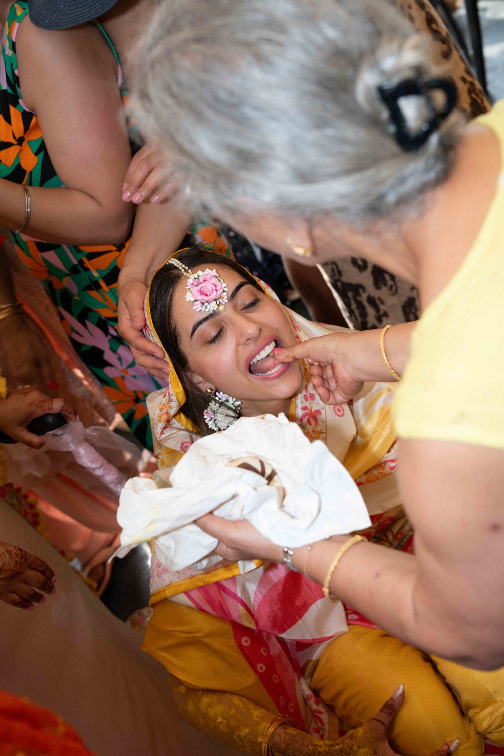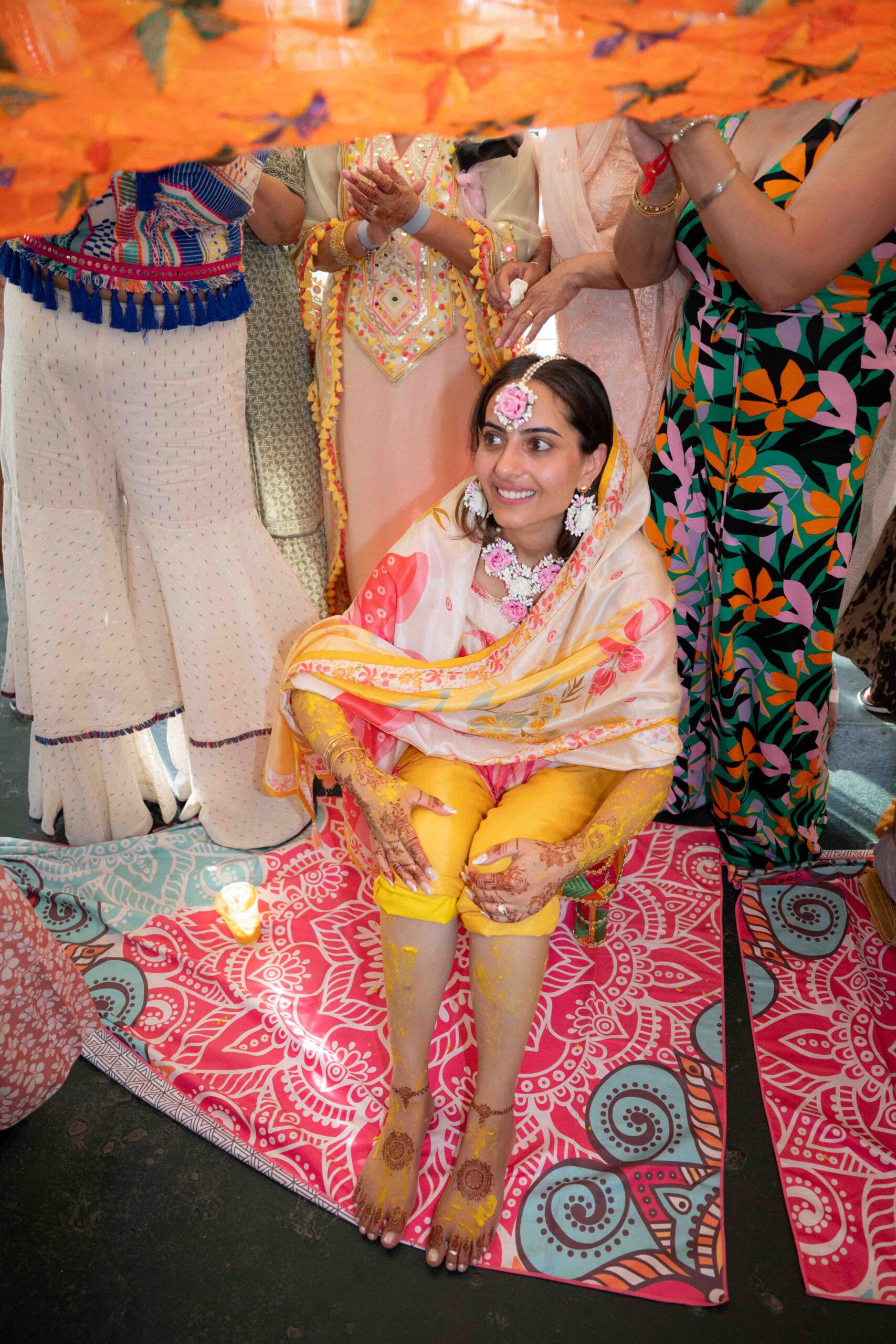 Der zweite Tag der indischen Hochzeit stand im Zeichen der Haldi-Zeremonie. Braut und Bräutigam wurden mit einer Kurkuma-Paste gesegnet, die ihnen Glück bringen sollte. Das leuchtende Gelb der Paste und die fröhliche Atmosphäre erzeugten spontane und liebevolle Momente, besonders als Freunde und Familie das Paar liebevoll einweihten.